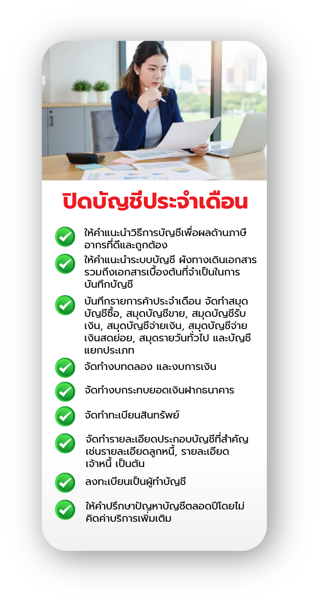 บริการปิดงบการเงิน ให้คำปรึกษาด้านบัญชีภาษีอากรจัดทำบัญชีรายปี, และวางแผนภาษีอากร, บริการรับทำเงินเดือน, บริการด้านประกันสังคม