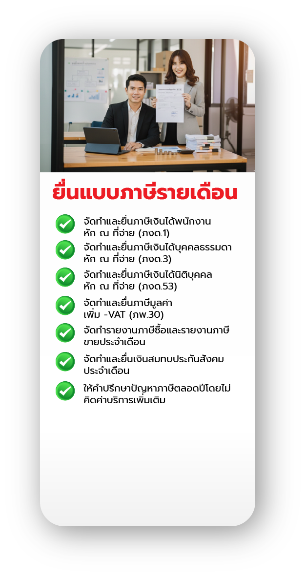 ทำภาษีเงินได้บุคคลธรรมดาประจำปี, ปิดงบการเงิน ให้คำปรึกษาด้านบัญชีภาษีอากรจัดทำบัญชีรายปี, และวางแผนภาษีอากร, บริการรับทำเงินเดือน